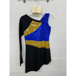 Asymmetrical neck, single sleeve, angular hem tunic. Side hip vents. Solid back. With Lycra, Metallic Shimmer, and Microsequin.