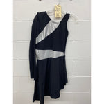 Asymmetrical neck, single sleeve, angular hem tunic. Side hip vents. Solid back. Black Lycra with silver metallic shimmer insets.