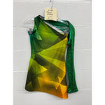 • One shoulder halter tunic, asymmetrical hem and wrap sleeve.