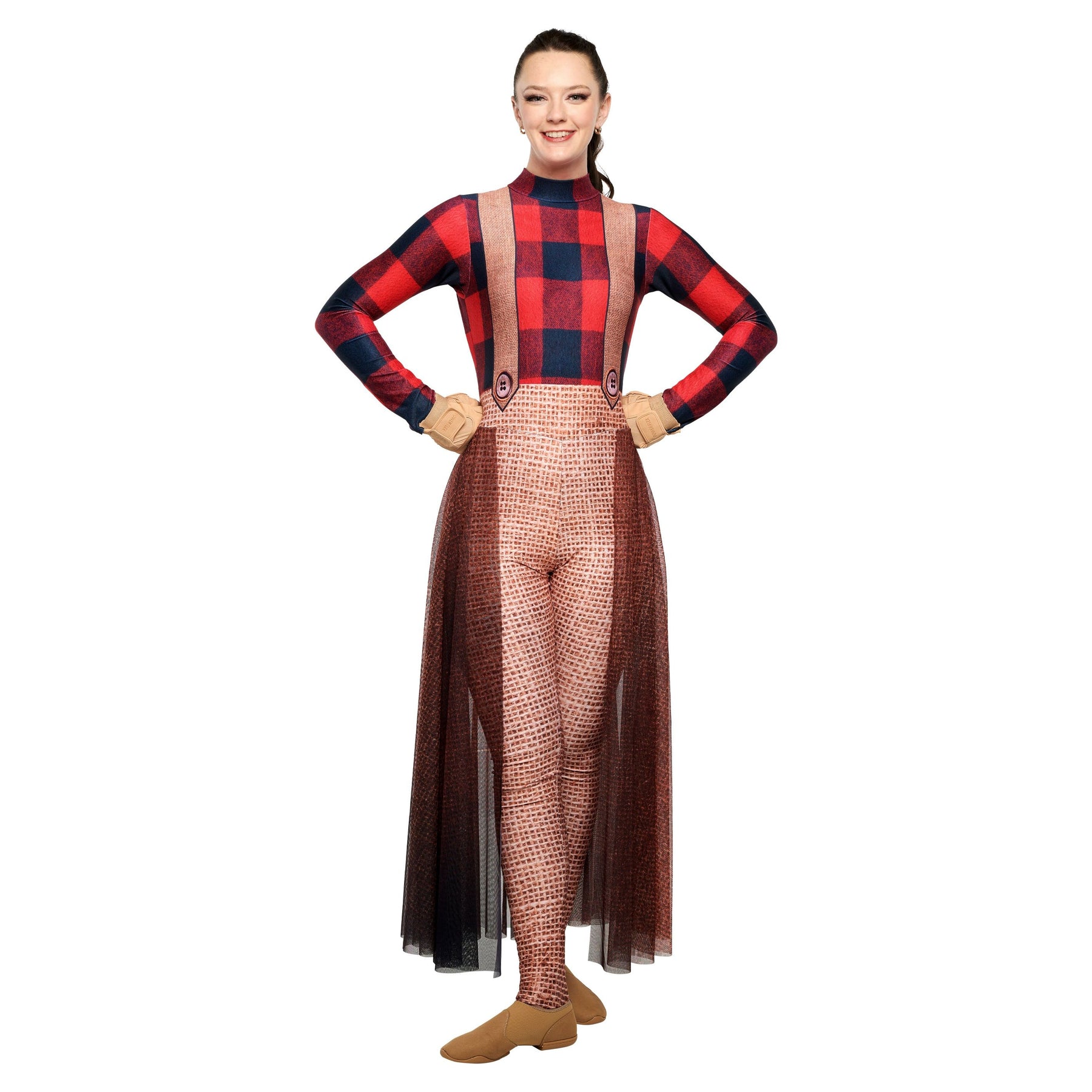 • Mock T Long Sleeve Legging Unitard with Long 3/4 Printed Mesh Skirt