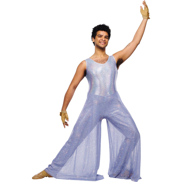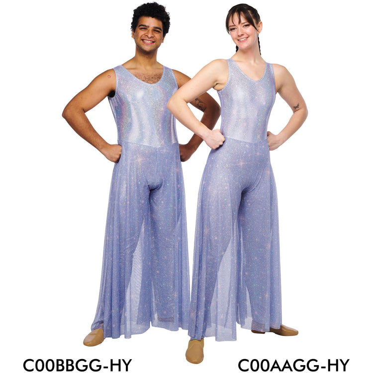 • Mono de pierna recta con escote en V y brillo resplandeciente con pantalones palazzo de malla con purpurina estampada